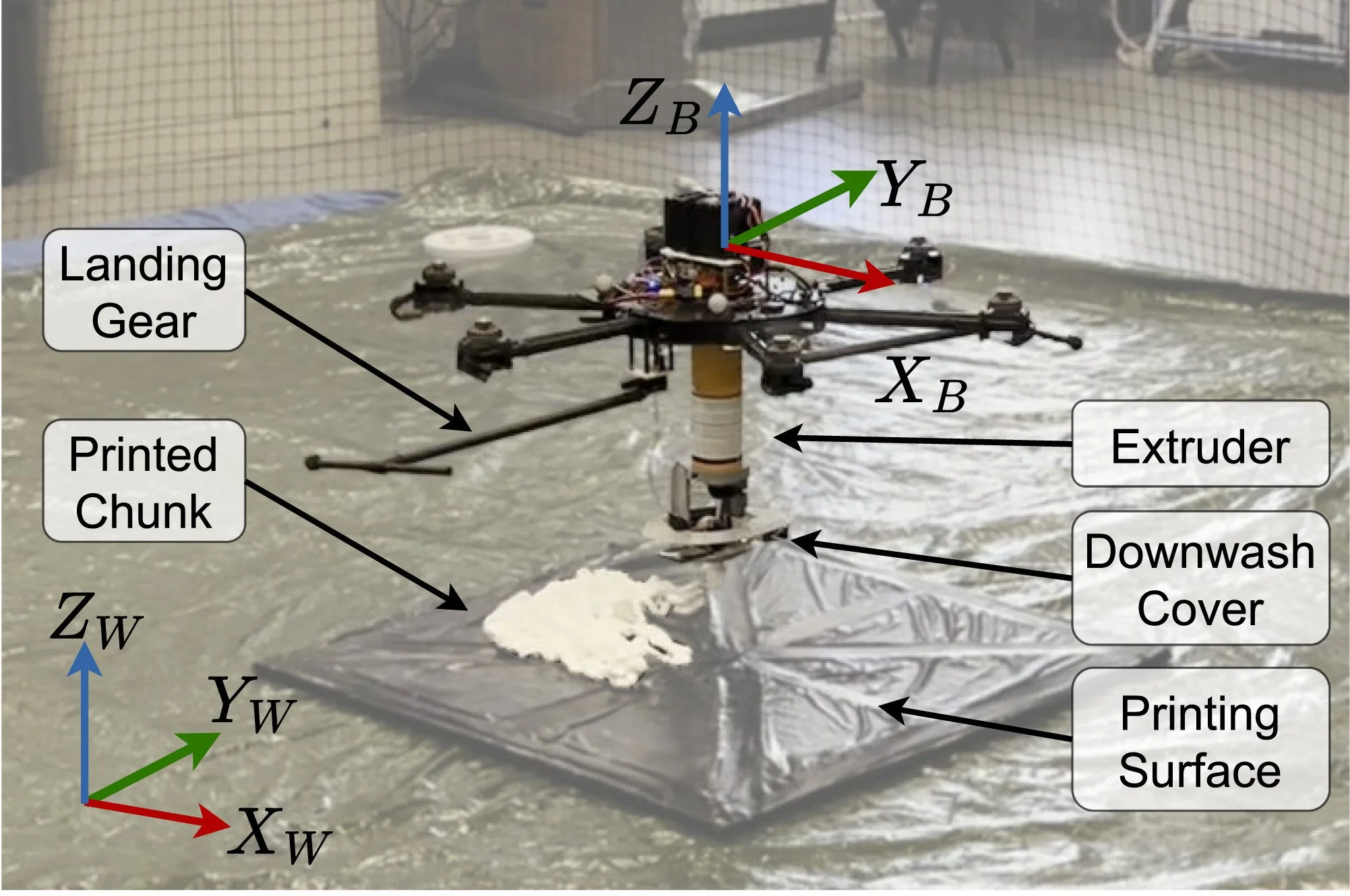 Experiments carried out in a motion-capture indoor arena demonstrated successful printing of two geometries, each divided into eight chunks. Protective skirts and interlocking stair-step patterns were used to improve stability and adhesion. Tracking errors were within 2–6 cm, with voxel-based analysis confirming close adherence to the planned designs.